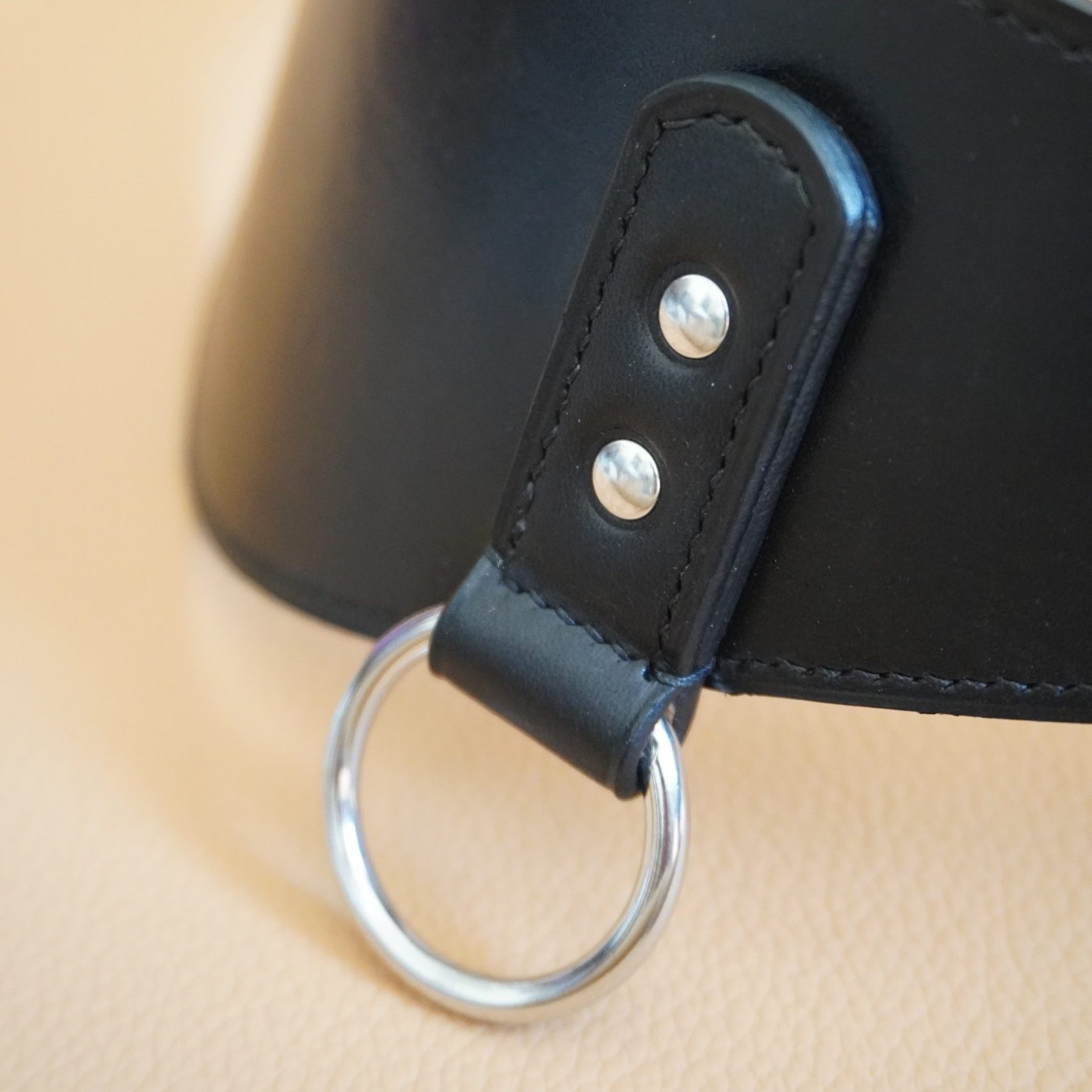 Wide belt in black vegetable tanned calf leather with light brown taurillon lining. Ideal to cinch the waist over a dress or a skirt. Saddle-stitched with a black waxed linen thread. Two loops to attach chains or tools. O-ring, D-rings, rivets and buckle in stainless steel for a silver finish.